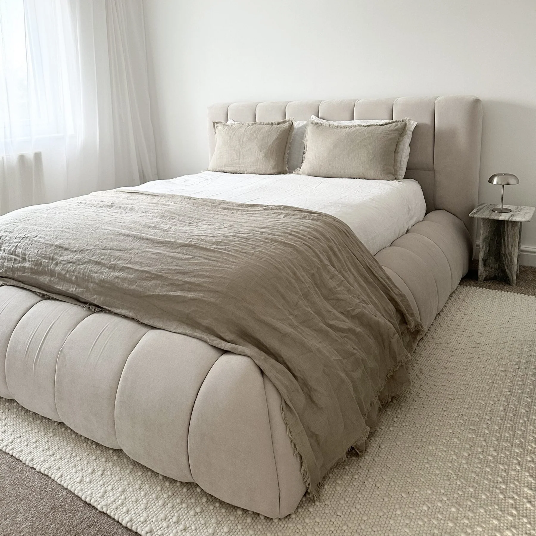 The Cloud Bed Bedframe showcases sweeping individually upholstered panels with a subtle border, creating a flawless contemporary appearance. The side rails are generously padded and stand taller than standard frames. The bed is completed with a matching paneled footboard.